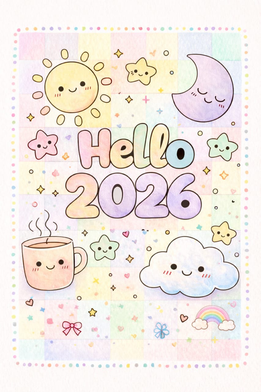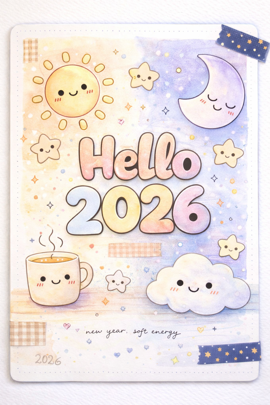 1️⃣ Hello 2026 – Kawaii friends with cute sun, moon, stars, mug, and cloud