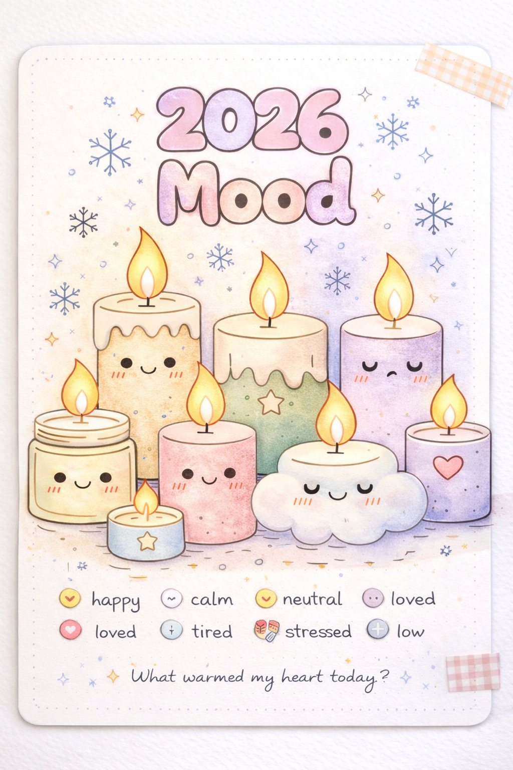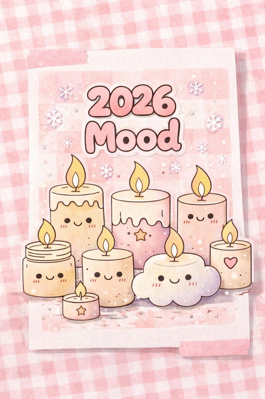 2️⃣ 2026 Mood – Cozy candles with sweet faces and winter snowflakes