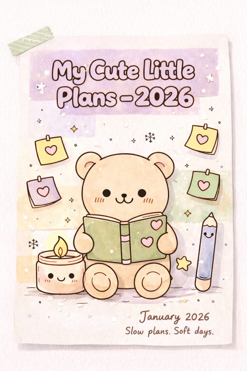 3️⃣ My Cute Little Plans – 2026 – Teddy bear planner cover with sticky notes and smiling stationery