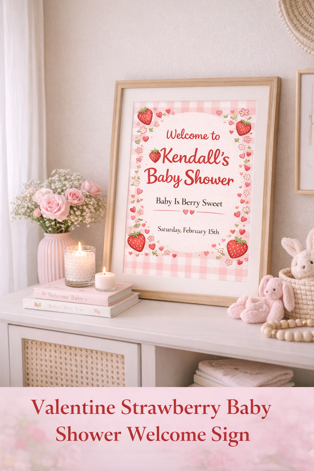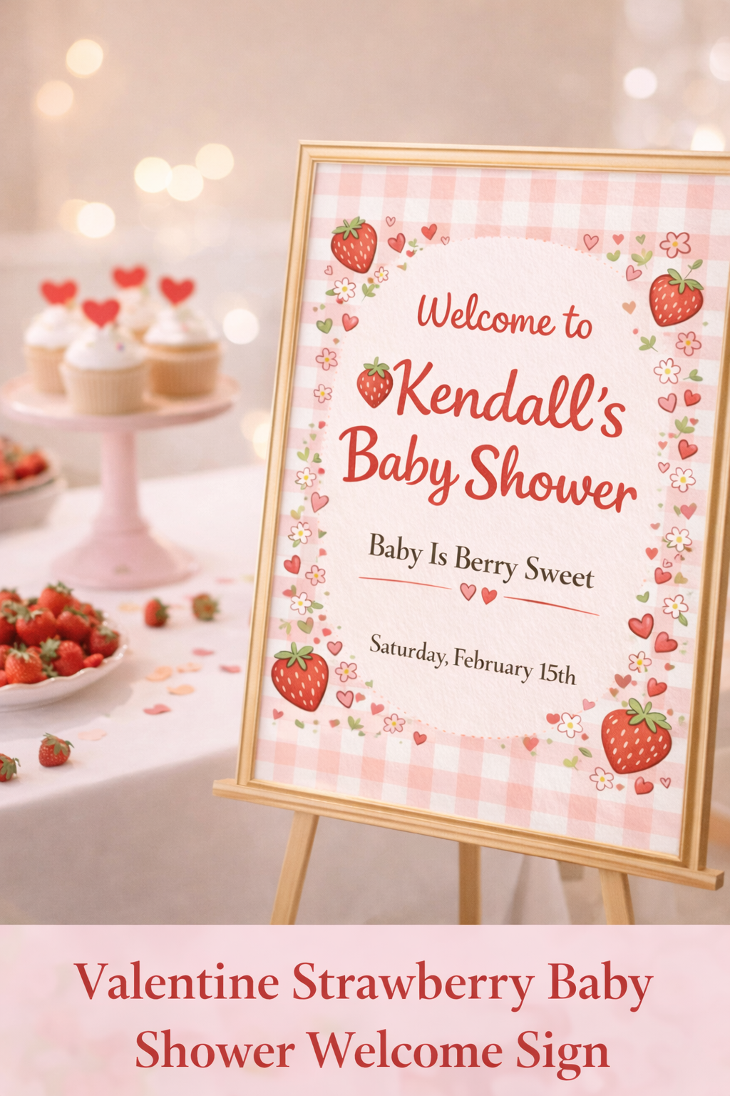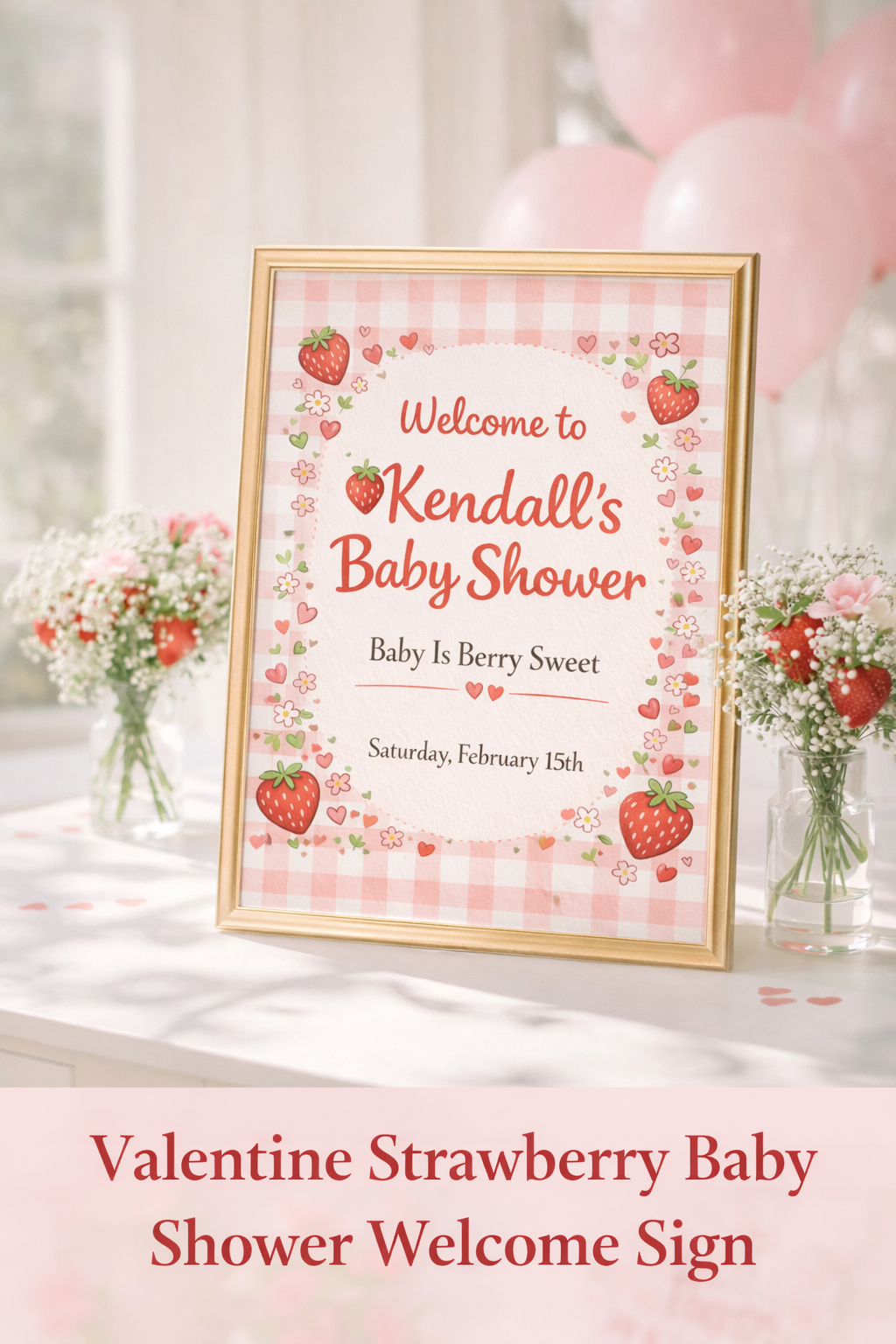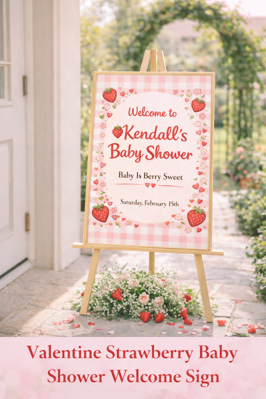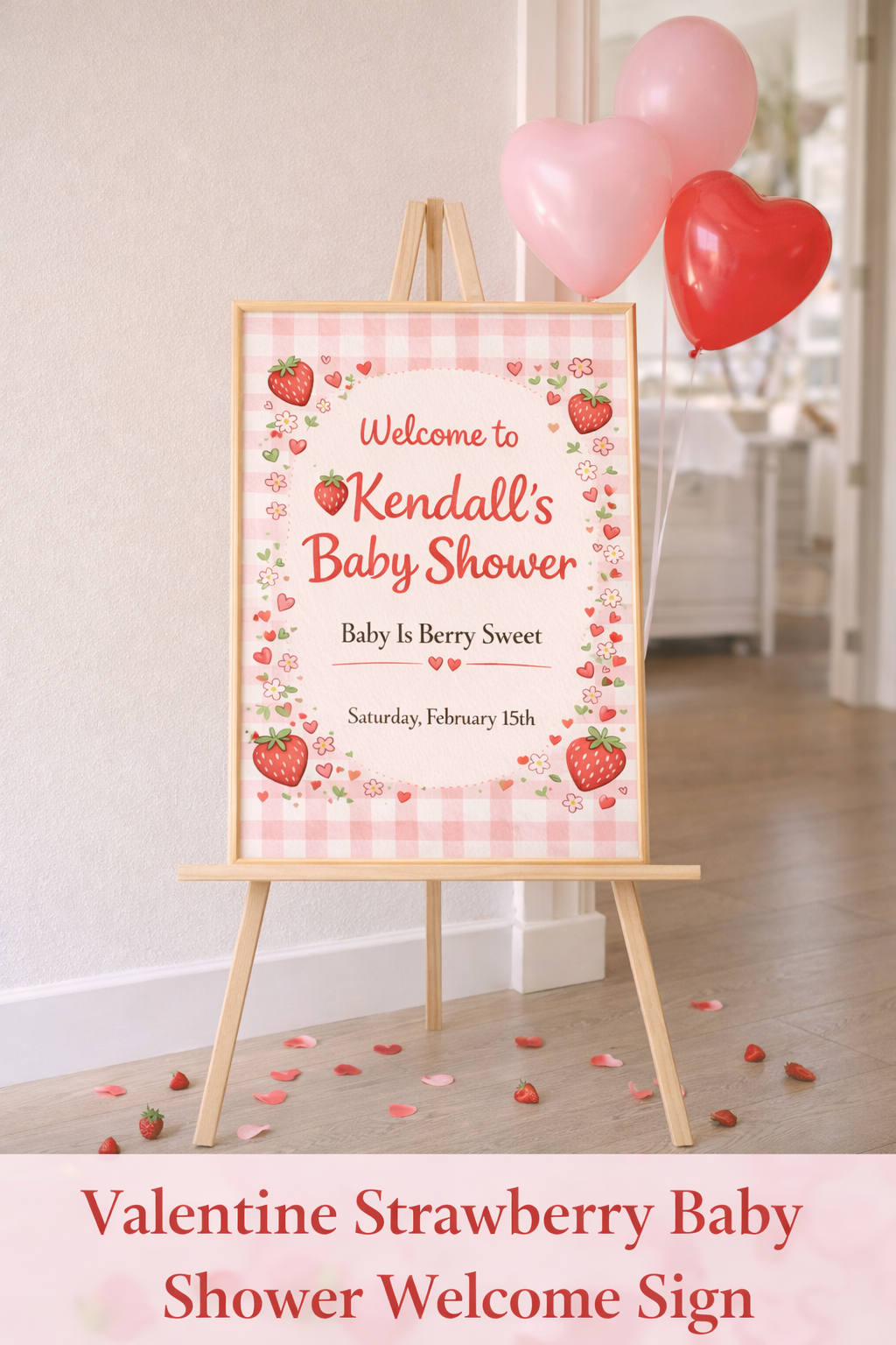 This cozy, cottagecore-inspired design is perfect for Valentine baby showers for girls and pairs beautifully with strawberry, berry sweet, and gingham themes. It creates a warm, photo-ready entrance that guests will love.