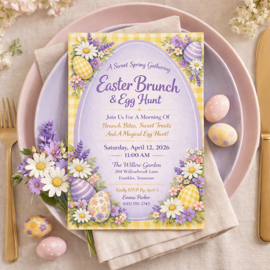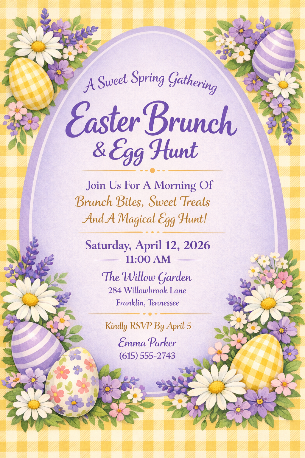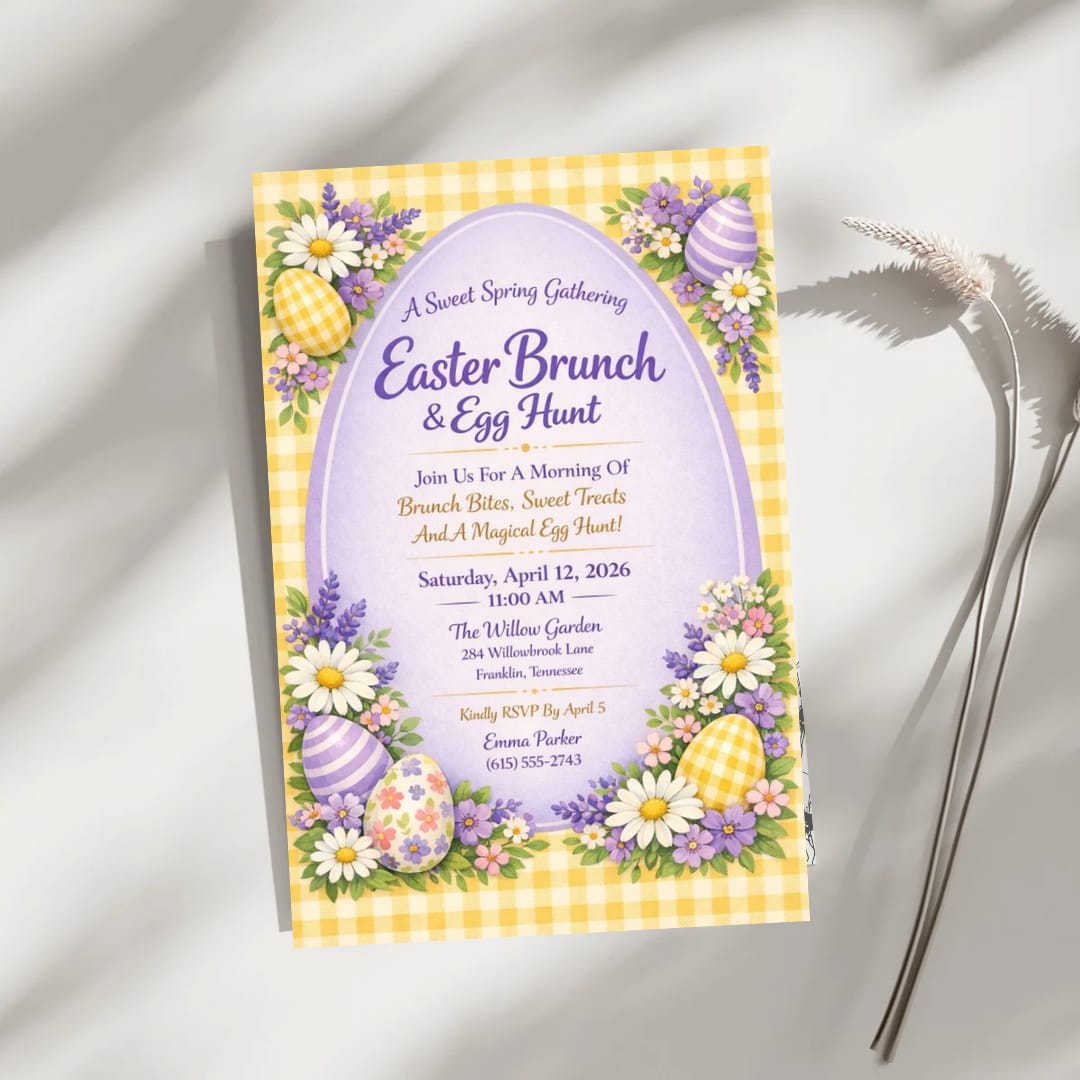 Celebrate spring with a sweet and cheerful Easter gathering! This Easter Brunch & Egg Hunt Invitation features a charming gingham background, pastel Easter eggs, and delicate spring florals in a soft butter yellow and lavender color palette. Perfect for hosting a festive Easter brunch, backyard egg hunt, or family spring celebration.