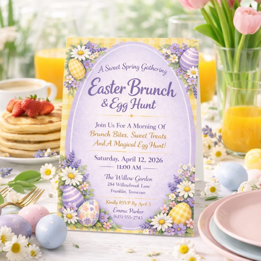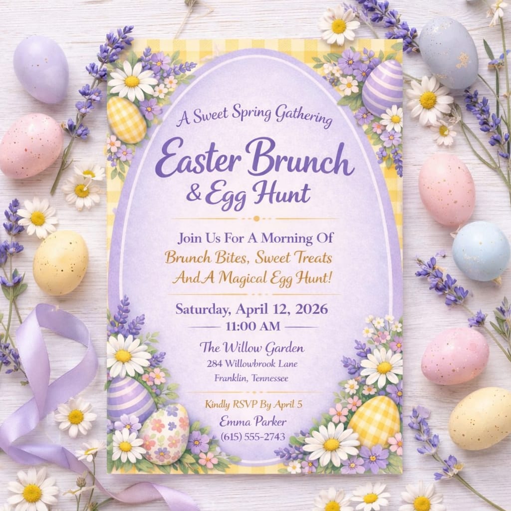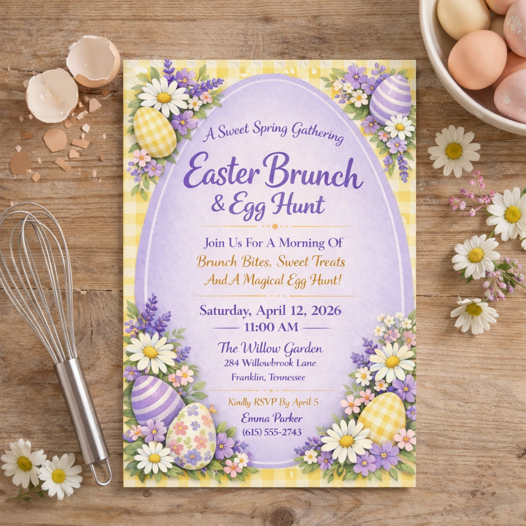 Celebrate spring with a sweet and cheerful Easter gathering! This Easter Brunch & Egg Hunt Invitation features a charming gingham background, pastel Easter eggs, and delicate spring florals in a soft butter yellow and lavender color palette. Perfect for hosting a festive Easter brunch, backyard egg hunt, or family spring celebration.