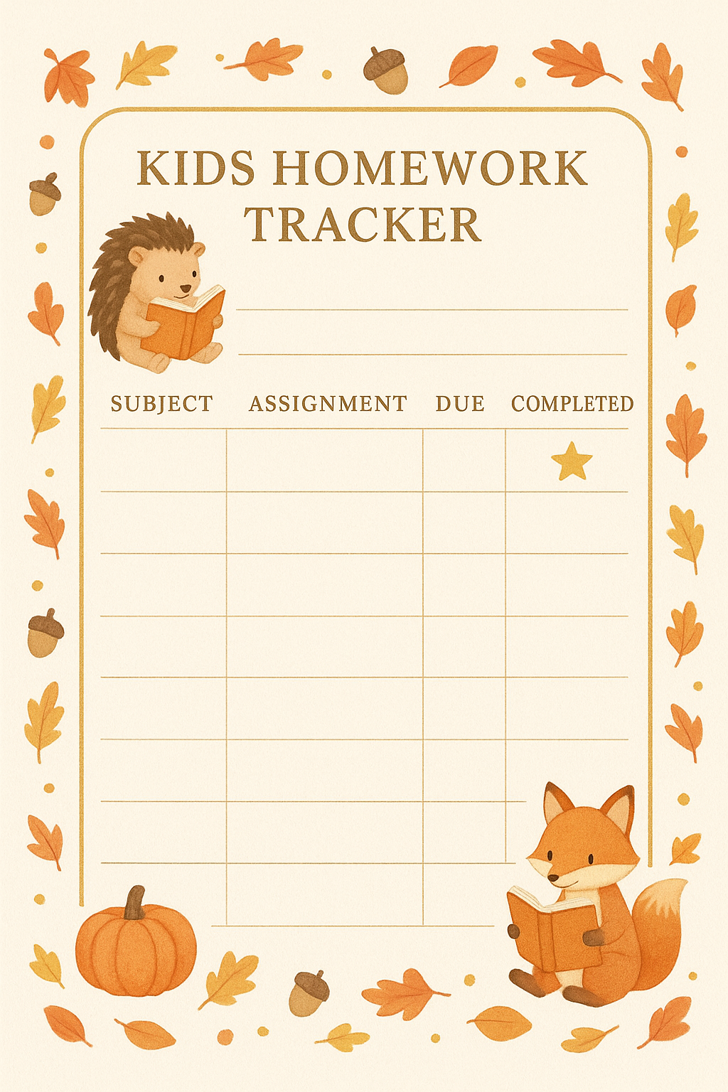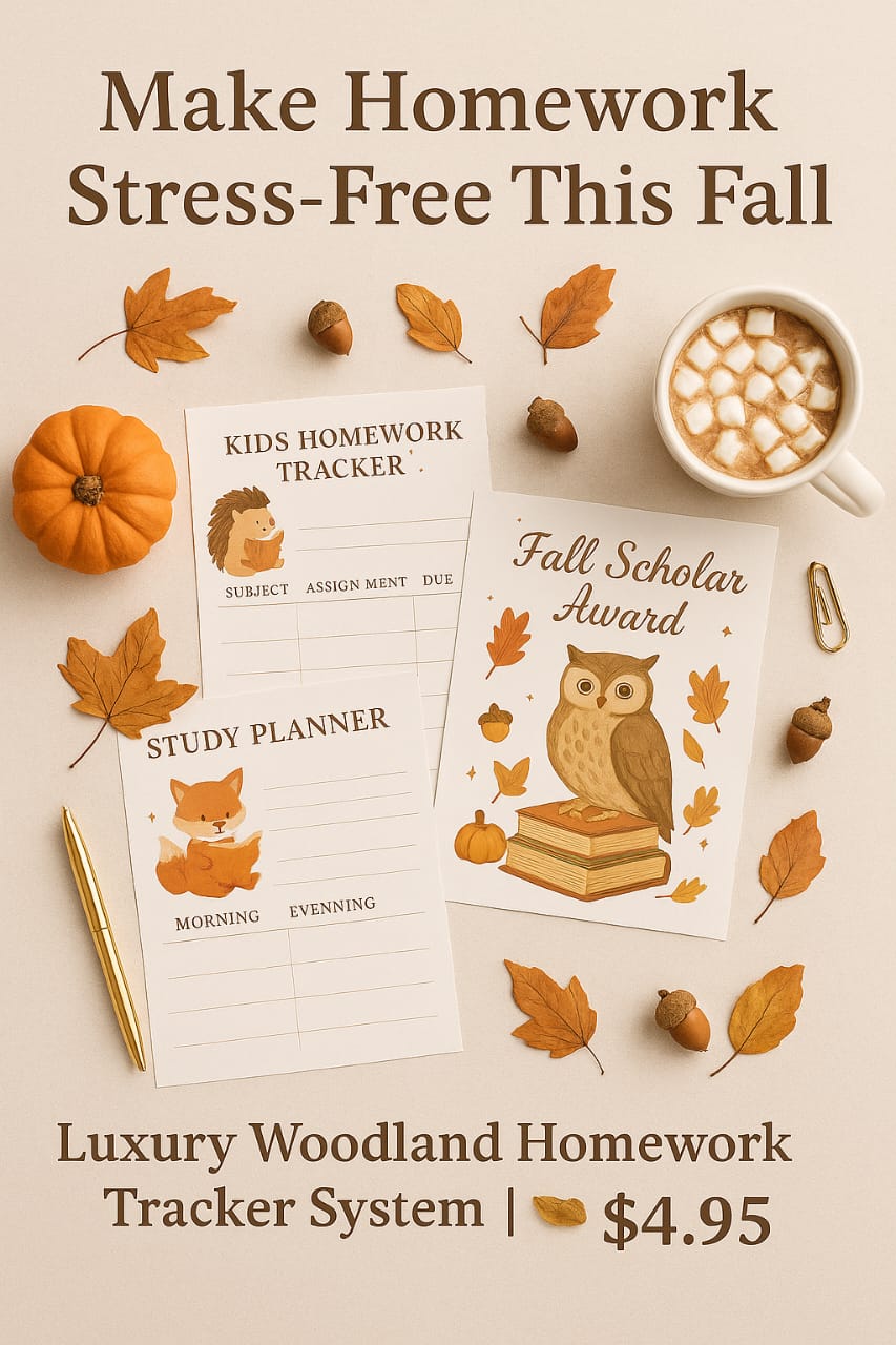 Make homework fun this fall with our Fall Themed Kids Homework Tracker Kit – Premium Autumn Animals Edition 🦊✨. Designed in cozy fall colors with adorable woodland animal illustrations, this 6-page printable kit motivates kids to track homework, plan study time, and celebrate progress with style.