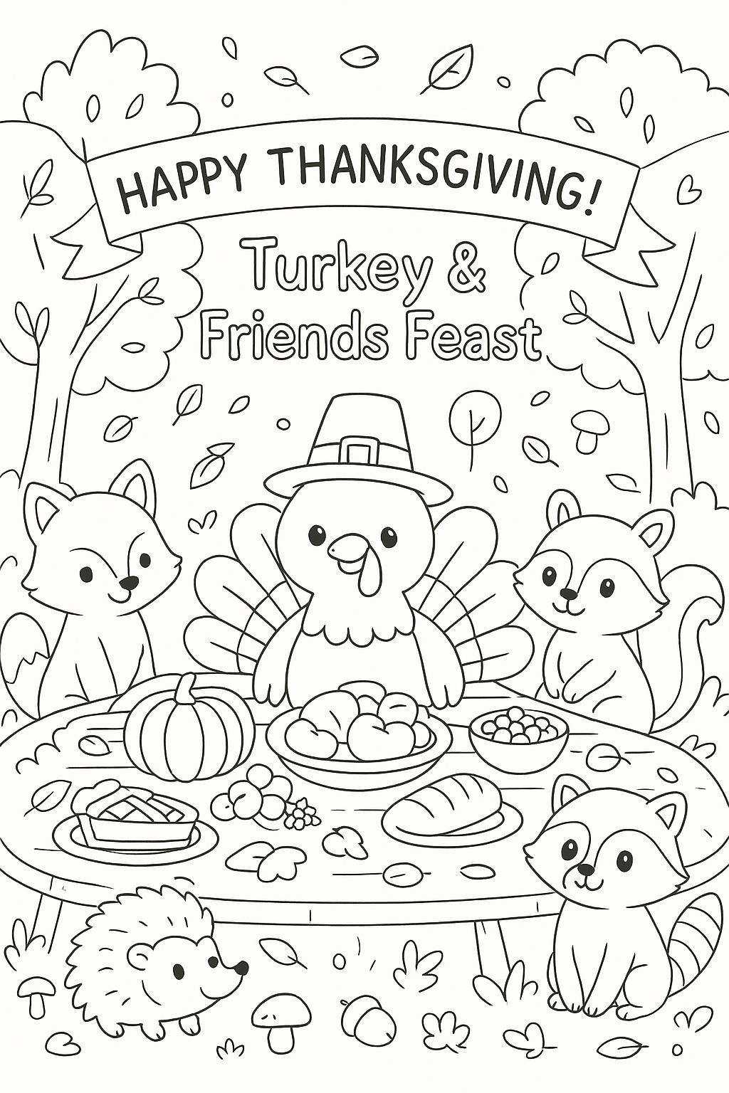 🧩 2️⃣ Coloring Pages – “Turkey & Friends Feast”, “Pumpkin Pie Party”, “Harvest Fun”