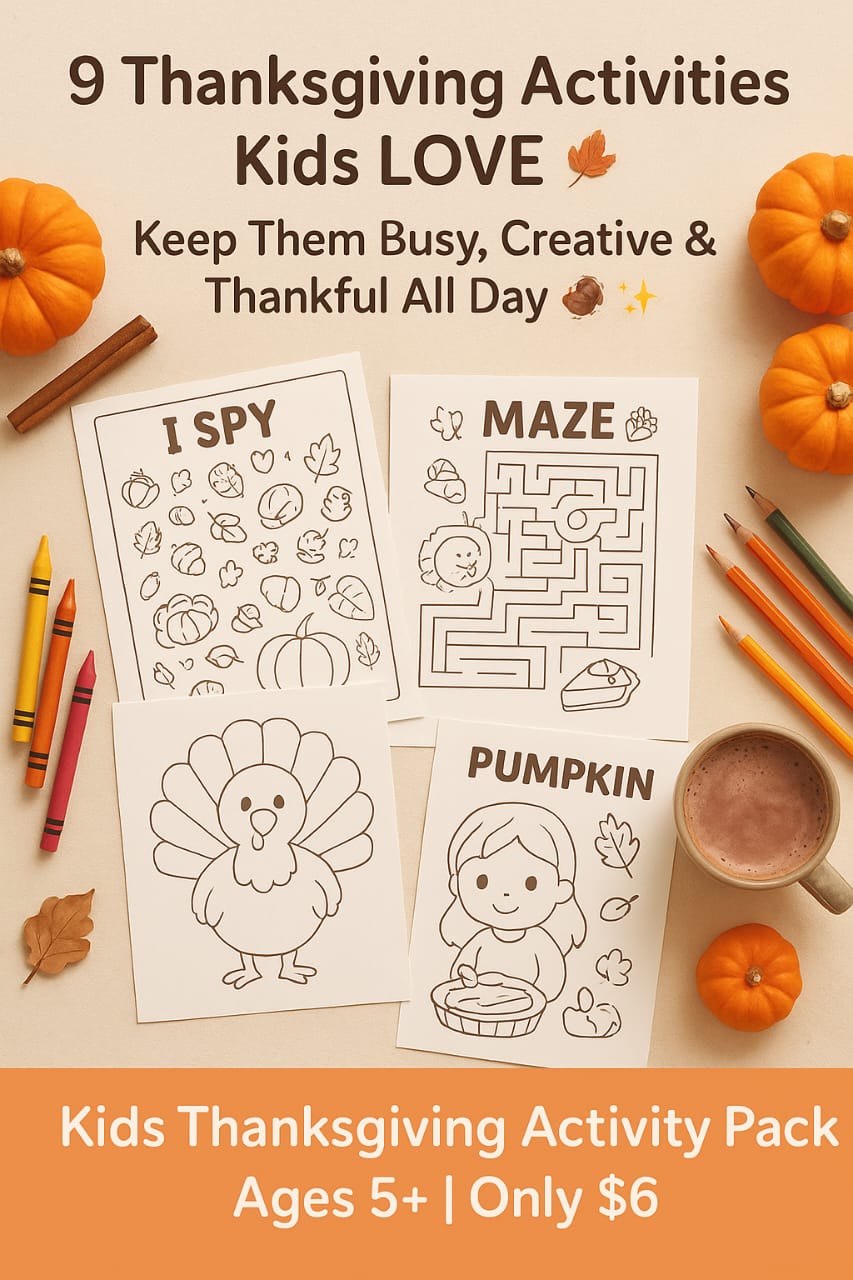 This Kids Thanksgiving Activity Pack Printable includes 9 premium, full-color pages of fun and learning designed especially for ages 5 and up. Moms, teachers, and homeschoolers love using this cozy printable bundle to keep kids engaged, creative, and thankful during the holidays.