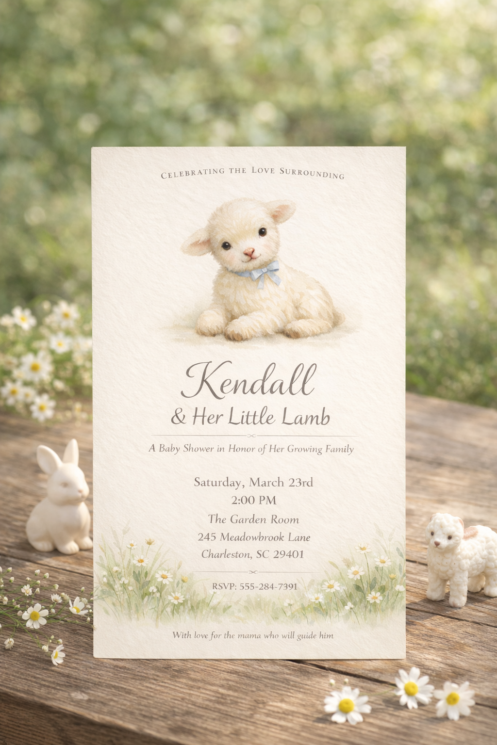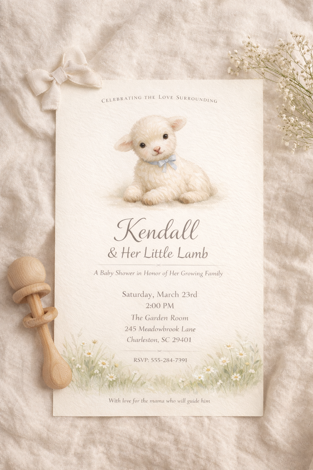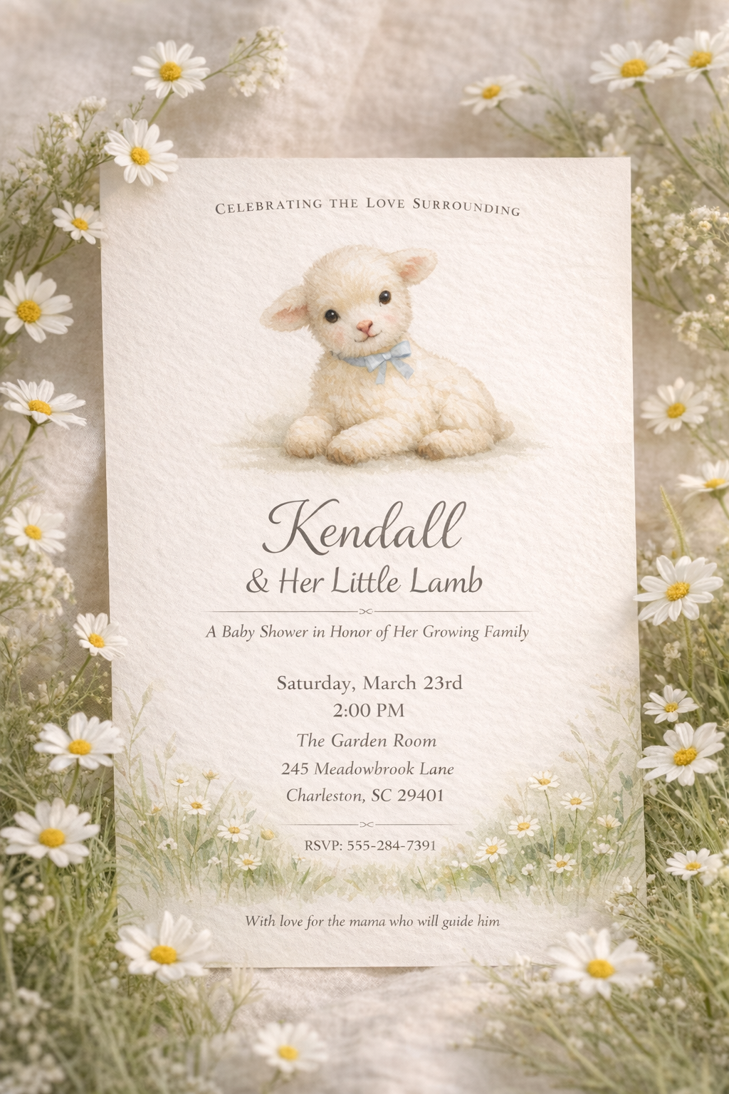 Little Lamb of Spring is a custom baby shower invitation crafted to celebrate the love surrounding an expectant mother as she awaits her little lamb.
