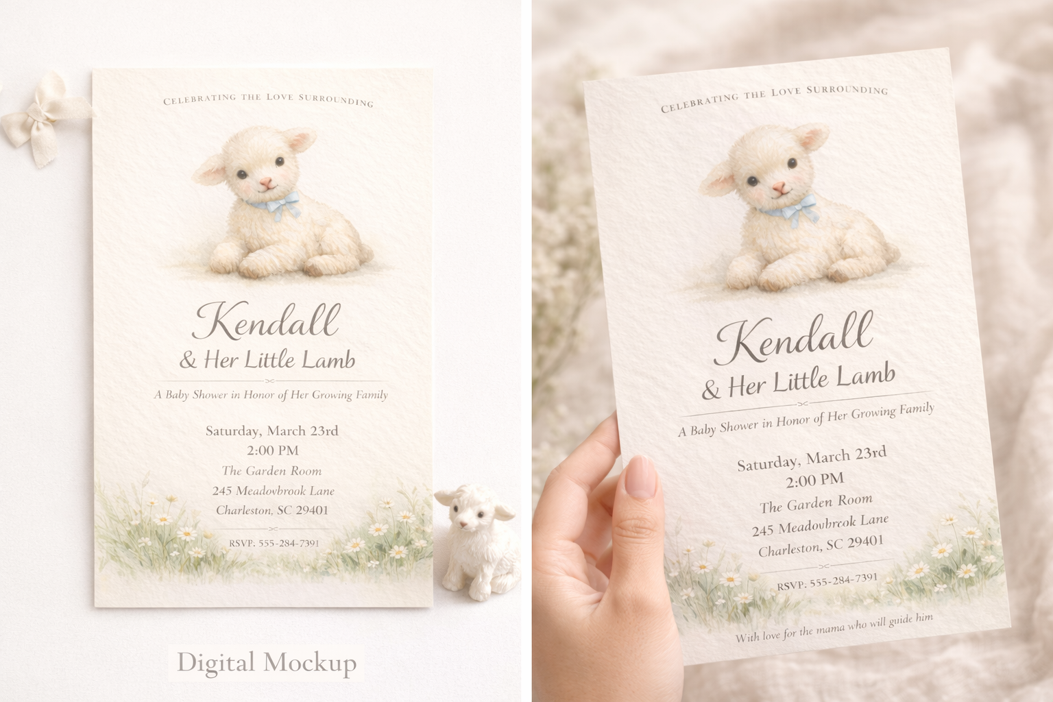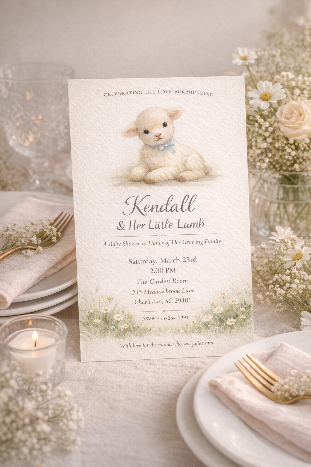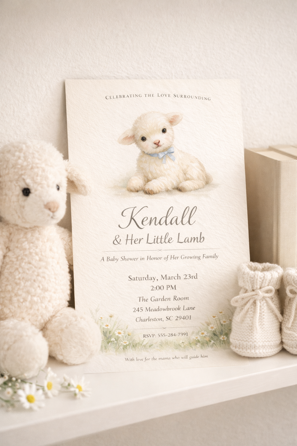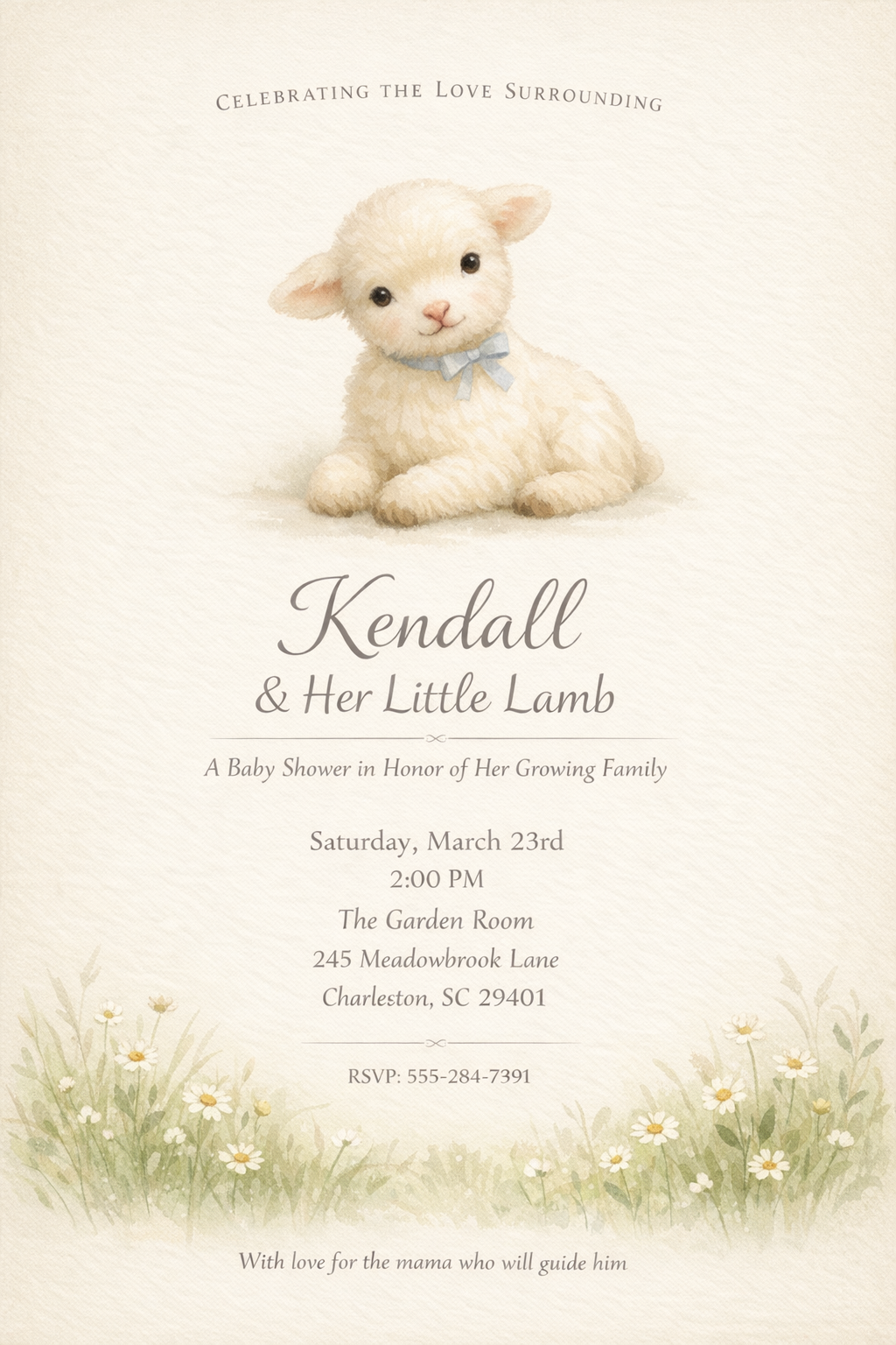 Little Lamb of Spring is a custom baby shower invitation crafted to celebrate the love surrounding an expectant mother as she awaits her little lamb.