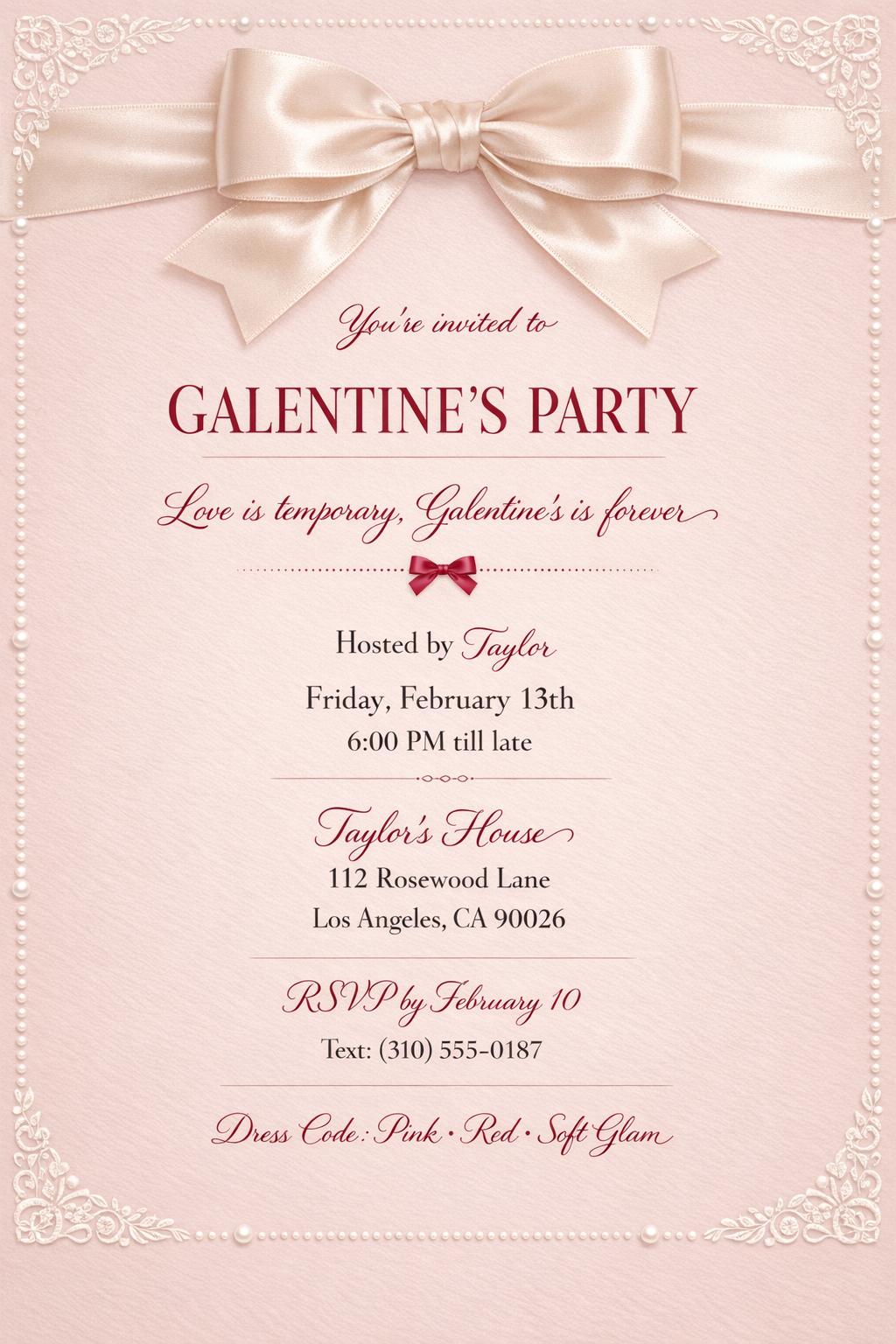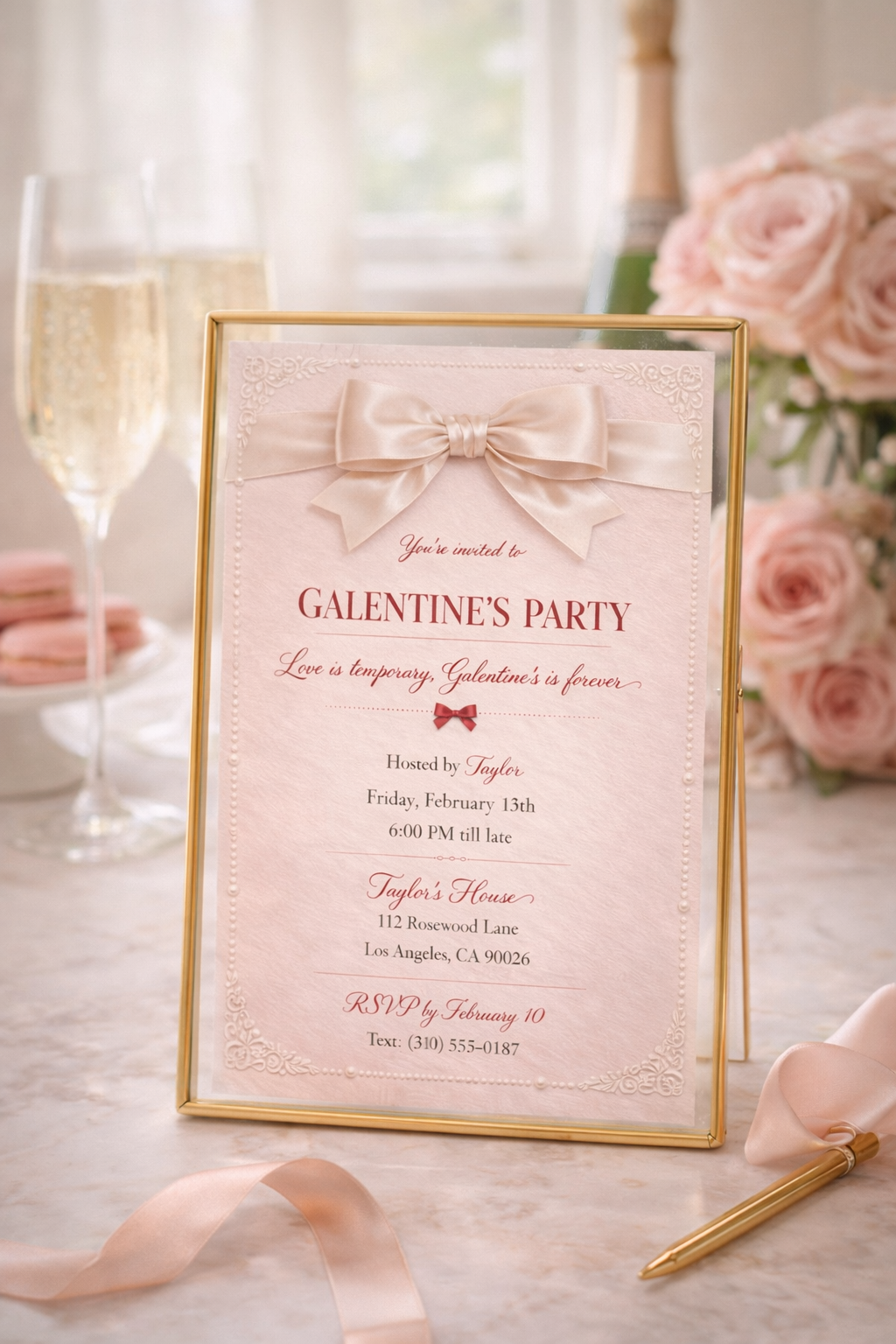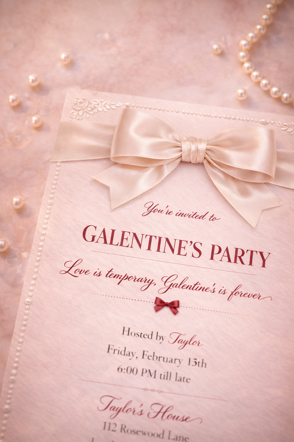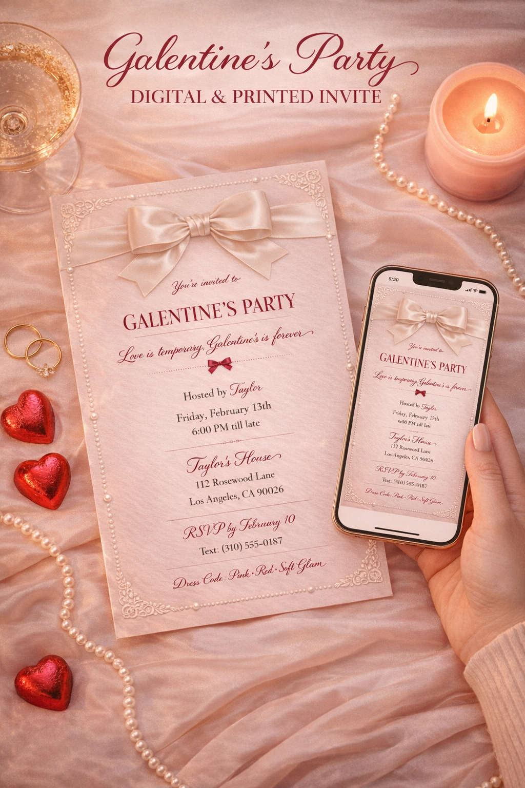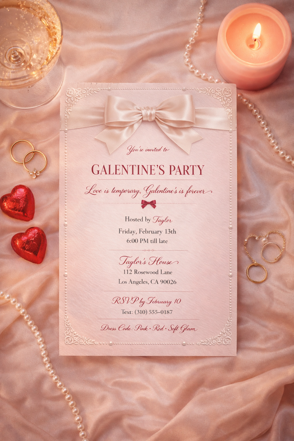 Perfect for chic house parties, girls’ nights, and soft glam Galentine’s celebrations, this invite is designed to feel personal, elevated, and unforgettable.