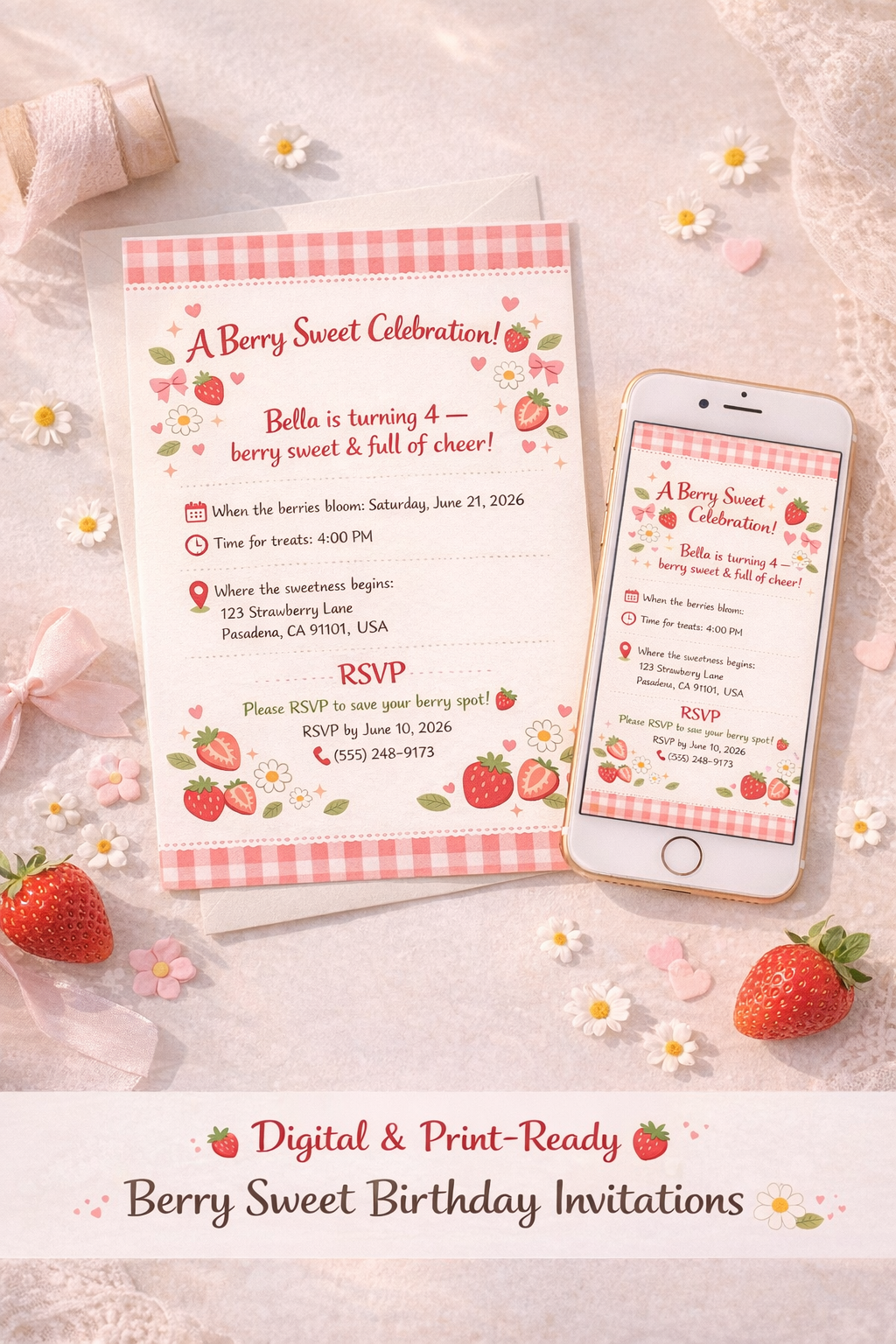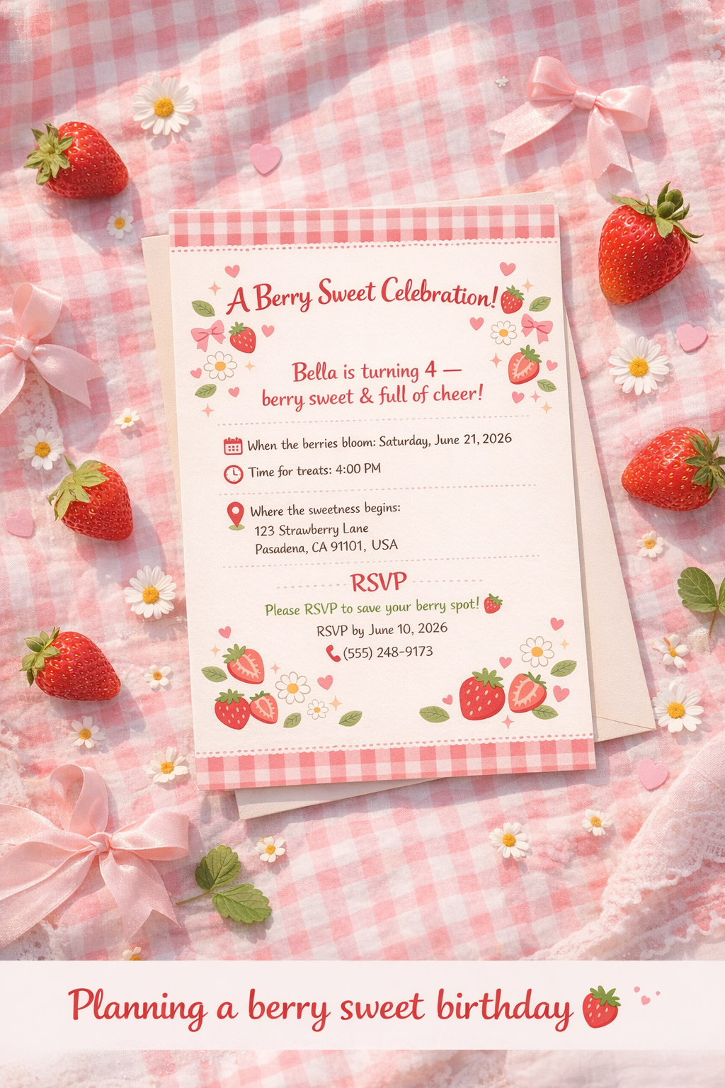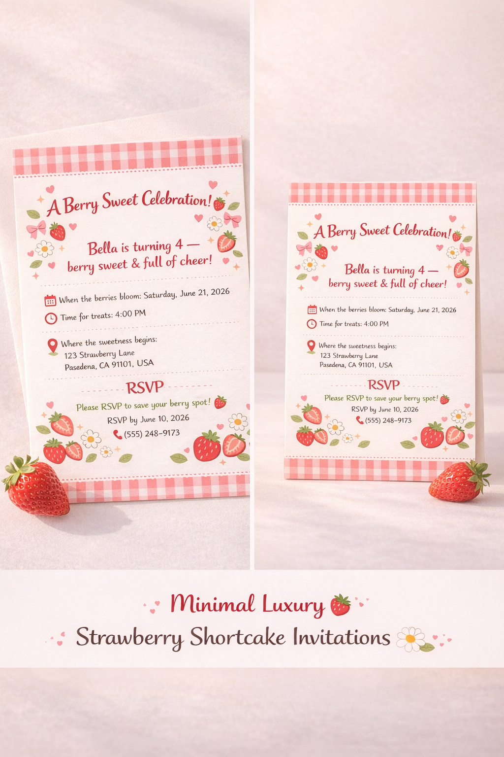 This invitation features hand-drawn strawberries, soft gingham patterns, and charming doodles for a warm, nostalgic feel. Perfect for girls’ birthdays, strawberry-themed parties, and cozy picnic celebrations.
