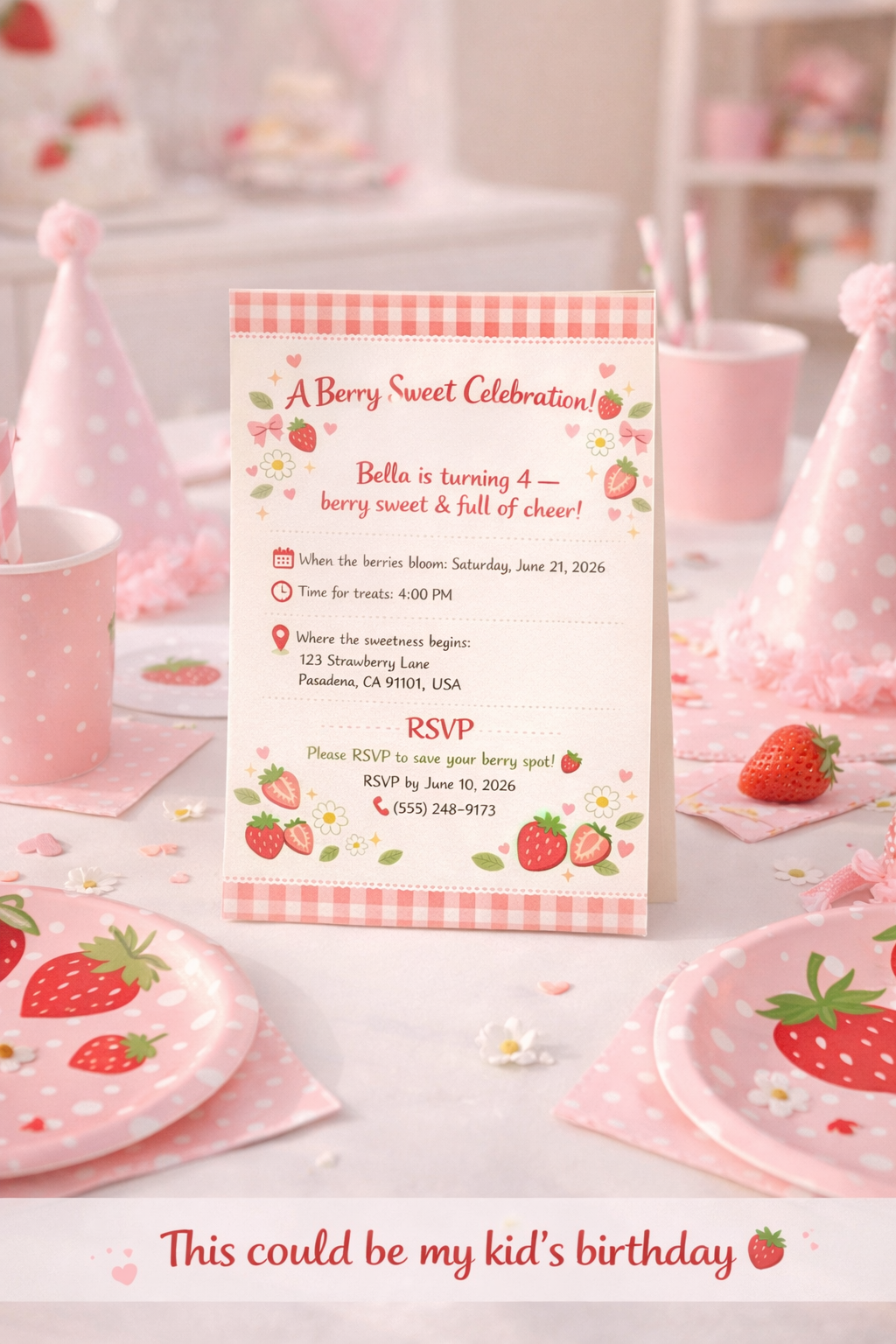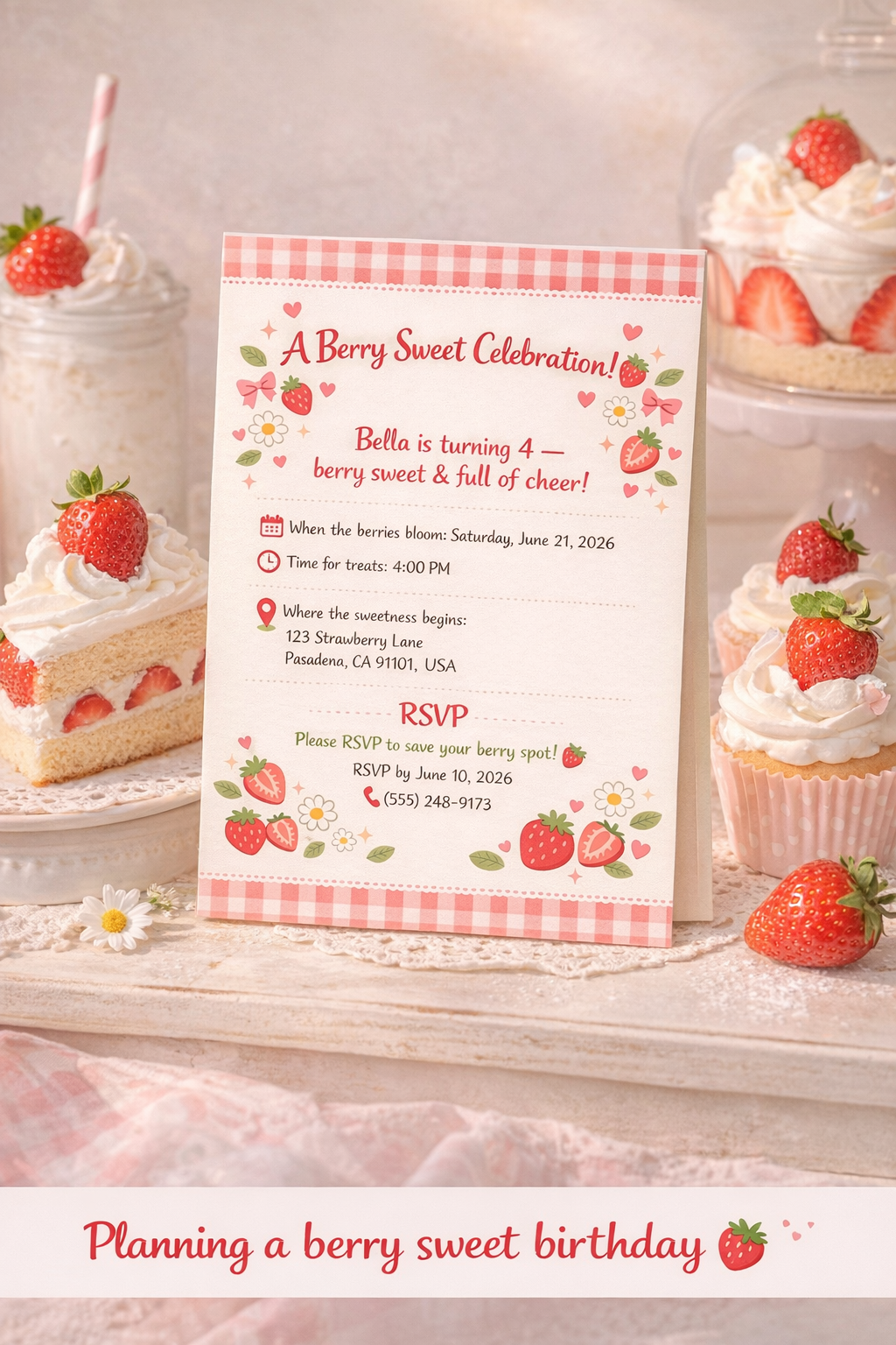 Create a sweet and cozy celebration with our Strawberry Shortcake Birthday Invitation, inspired by the trending Berry Sweet aesthetic loved by moms in 2025.