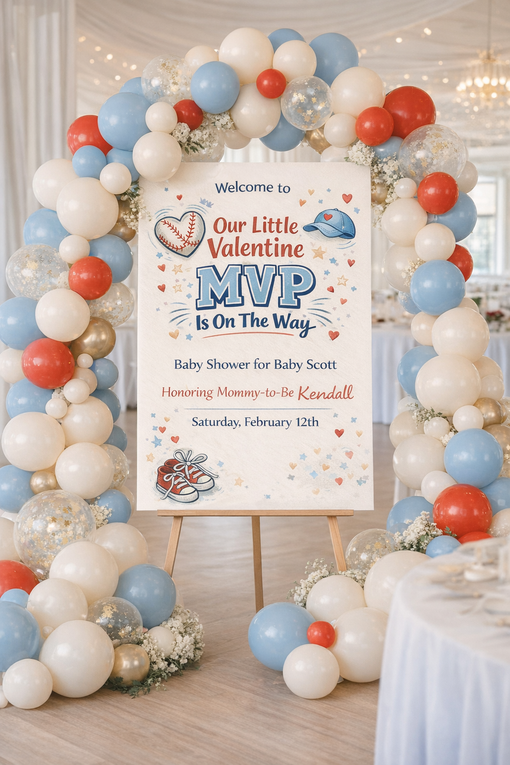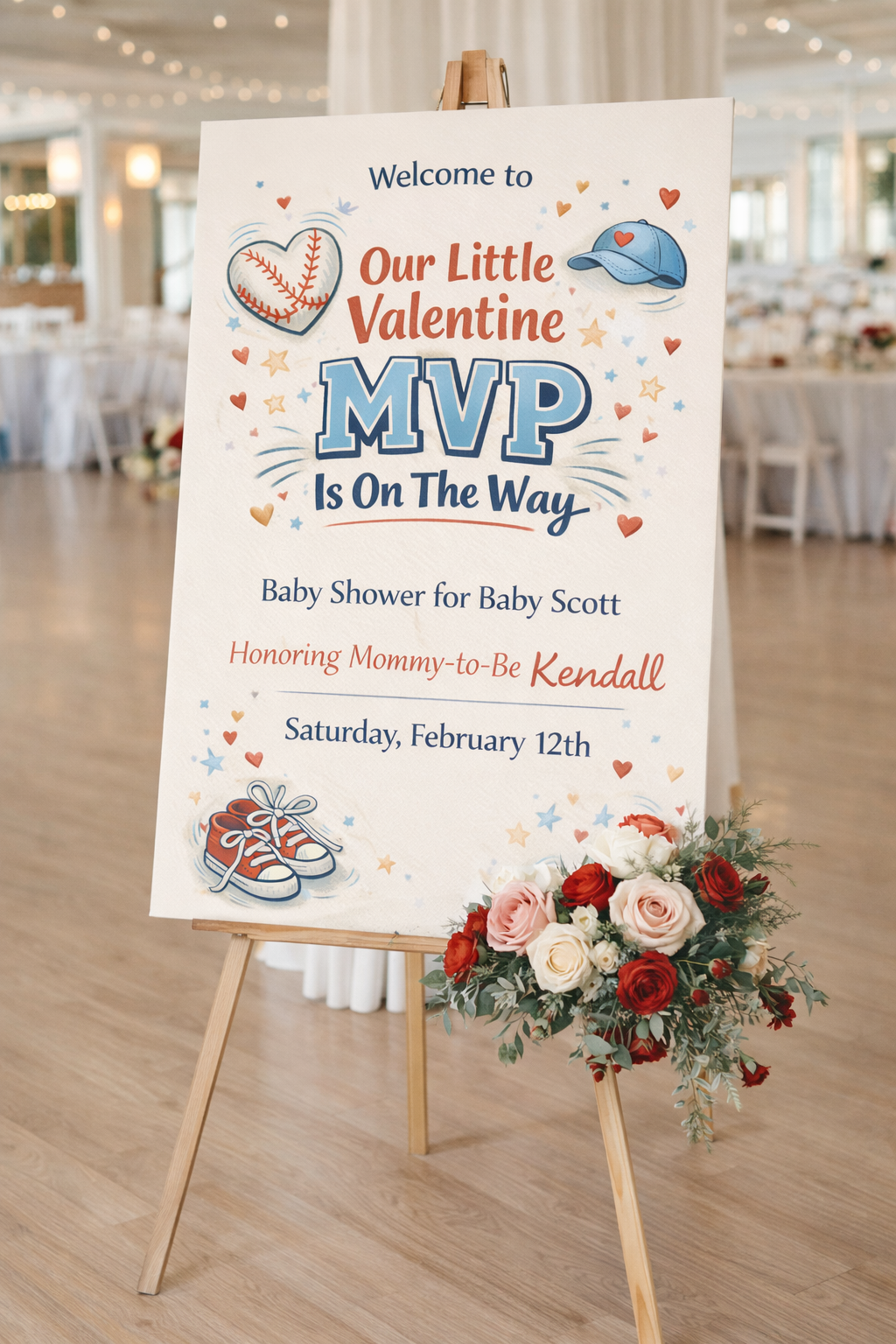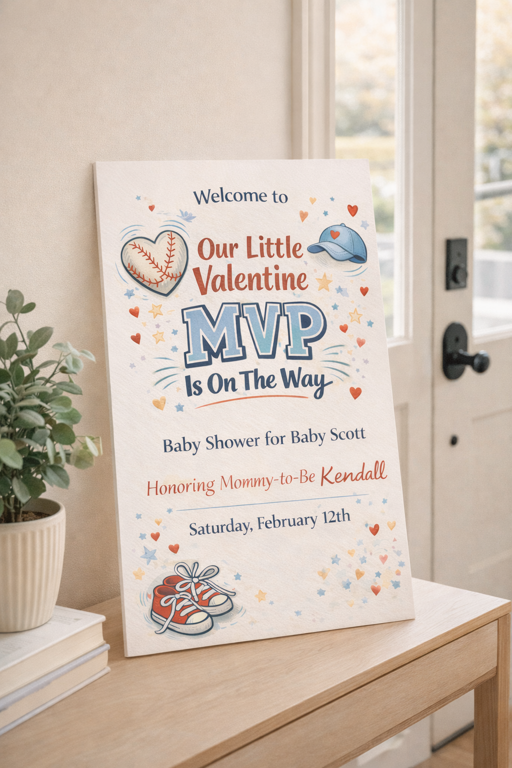 Welcome guests in style with this sporty and adorable Valentine MVP Baby Shower Welcome Sign — designed for boy baby showers with a playful Valentine twist.